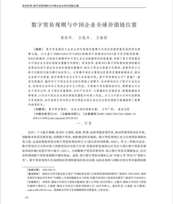 近日,我院侯俊军教授、王胤丹博士以及王振国博士后合作撰写的学术论文《数字贸易规则与中国企业全球价值链位置》在《中国工业经济》2023年第4期刊出。《中国工业经济》期刊由中国社会科学院工业经济研究所主办,是我国产业经济学领域的权威学术期刊。