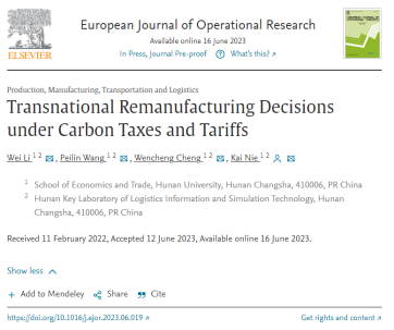 近日,我院李巍教授、王沛麟博士生、本科毕业生程文成、聂凯副教授合作撰写的论文“Transnational Remanufacturing Decisions under Carbon Taxes and Tariffs”在European Journal of Operational Research在线刊出。European Journal of Operational Research为运筹学与管理科学领域国际权威期刊,ABS评级四星期刊。