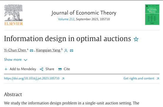 近日,我院杨湘黔助理教授作为通讯作者与合作者Yi-Chun Chen教授(来自新加坡国立大学)合作撰写的论文“Information design in optimal auctions”(作者名按字母序排列)在国际公认的经济学顶级期刊Journal of Economic Theory正式online见刊。