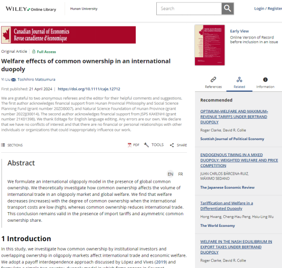 近日,我院刘懿副教授与东京大学Toshihiro Matsumura教授合著论文“Welfare effects of common ownership in an international duopoly”被《Canadian Journal of Economics》(CJE)录用。CJE是由加拿大经济学会主办的综合性经济学期刊,在经济学界享有良好声誉和广泛认可度,是我院院定A2权威期刊。