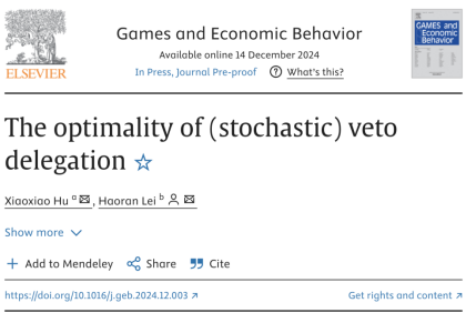 近日,我院雷浩然助理教授与合作者的研究论文“The Optimality of (Stochastic) Veto Delegation”被博弈论与经济学领域国际顶尖期刊Games and Economic Behavior正式接收。Games and Economic Behavior期刊创办于1989年,是Game Theory Society(博弈论学会)两大会刊之一,由Elsevier(爱思唯尔)公司出版。