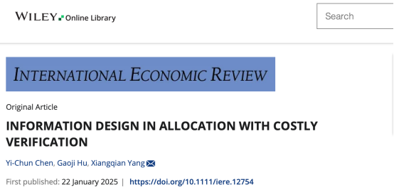 近日,我院杨湘黔副教授与合作者Yi-Chun Chen教授(新加坡国立大学)、虎高计副教授(上海财经大学)合作撰写的论文“Information design in allocation with costly verification”(作者名按字母序排列)在经济学国际顶级期刊International Economic Review正式online见刊。