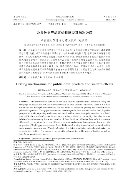 近日,我院刘征驰教授、博士生李慧子、24届博士陈文武和高步渠副教授合作撰写的学术论文《公共数据产品定价机制及其福利效应》在《系统工程理论与实践》2025年第3期刊出。《系统工程理论与实践》期刊是由中国科学技术协会主管、中国系统工程学会主办的集系统科学、管理科学、信息科学等为一体的重要学术期刊。