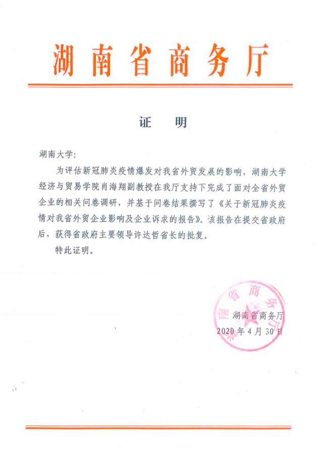 近日,从湖南省商务厅传来消息;为评估新冠肺炎疫情爆发对我省外贸发展的影响,yl23411集团肖海翔副教授在我厅支持下完成了面对全省外贸企业的相关问卷调研,并基于问卷结果撰写了《关于新冠肺炎疫情对我省外贸企业影响及企业诉求的报告》。该报告在提交省政府后,获得省政府主要领导许达哲省长的批复。