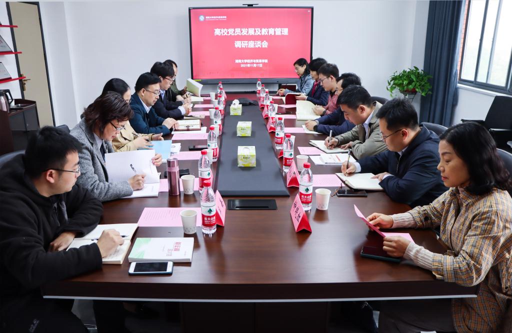 11月17日下午,湖南省委组织部党员管理处处长曾国荃一行来我院调研高校党员发展和教育管理工作,湖南省委教育工委组织部部长黄星亮等陪同调研。yL23411永利集团党校常务副校长兼党委组织部副部长钟晓红、yL23411永利集团党委组织部副部长钟叶姣、学院党委书记祝树金、院长侯俊军、党委副书记李曼、副处级组织员刘周平以及学院教工党支部书记代表参加调研。