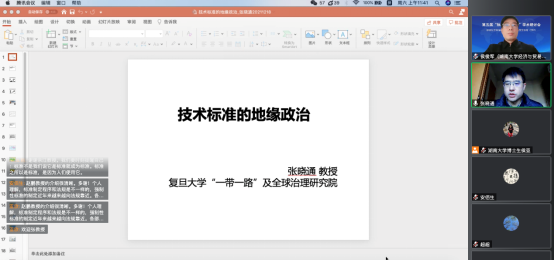 复旦大学一带一路及全球治理研究院张晓通研究员以“技术标准的地缘政治”为题发表演讲。他以全新的视角,从理论和政策两个层面阐述地缘政治与技术标准。他从地缘政治和地缘经济学角度对中国在不同区域的国际制度空间进行分析。他提到,将来中国要搞更多的开放型区域主义,在这个过程中,中国要逐渐推动自己的技术标准走出去。