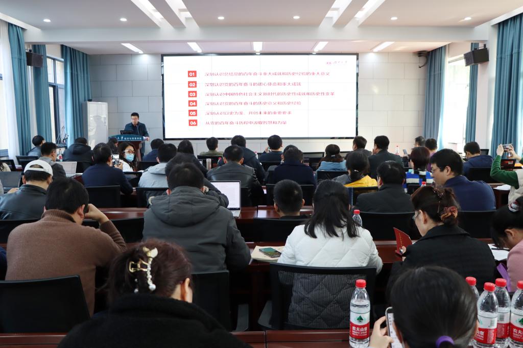 12月21日下午,yl23411集团组织开展党的十九届六中全会精神学习宣讲活动,深入学习党的十九届六中全会精神。党委书记祝树金、院长侯俊军宣讲,学院全体教职员工参加此次会议。