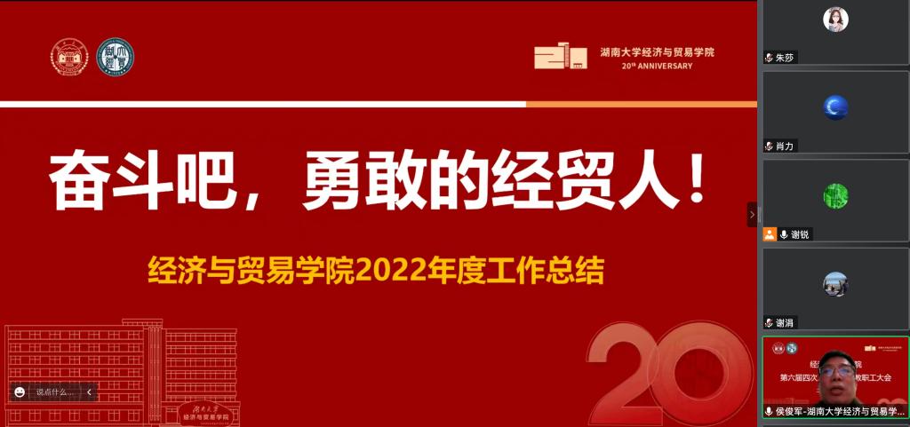 院长侯俊军以“奋斗吧,勇敢的经贸人!”为主题作学院工作报告。报告指出:全院教职员工在过去的一年,克服疫情反复等诸多不利因素,紧扣学科建设年、迎接党的二十大与建院二十周年等主题,同心同德,不懈奋斗,取得了一系列喜人成绩,学科建设迈上新台阶,应用经济学进入A类学科。年度关键指标得以顺利完成,大多数指标超额完成;建院二十周年系列活动开展,梳理了学院历史、联络了广大校友、加强了学术交流、扩大了学院影响。他希望在2023年,学院上下继续保持向上的斗志,持续创新,在新的建设历程中创造新的辉煌。