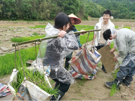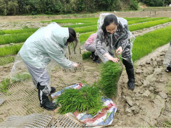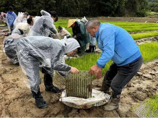 座谈会后,经贸学院师生深入田间地头,实际体验春耕。当地村民为同学们详细介绍了再生稻的优势,分享了育秧、插秧、田间管理、成熟的过程,演示了插秧基本动作,在村民的指引下,师生协作分组作业,共同完成了分苗、运苗、抛秧的春季耕种全流程。