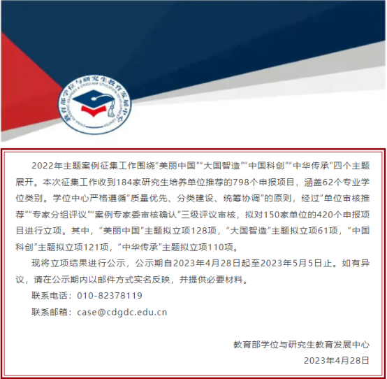 2022年主题案例征集由教育部学位与研究生教育发展中心举办,旨在面向名校名院名家,汇聚各方力量,开发具有时代性、引领性、价值性的高质量案例,主要围绕“美丽中国”“大国智造”“中国科创”“中华传承”四个主题展开。共收到184家研究生培养单位推荐的798个申报项目。学位中心通过“单位审核推荐”“专家分组评议”“案例专家委审核确认”三级审核,最终150家单位的420个项目获得立项。