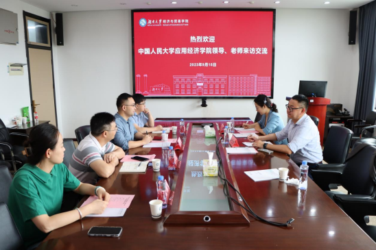 9月15日,中国人民大学应用经济学院院长协理安子栋、教务办公室副主管张男一行来我院访问,我院副院长肖皓、副院长谢锐、财政税务系教授谭光荣、国际经济与贸易系副主任吴施美参加调研座谈会。会议由副院长肖皓主持。