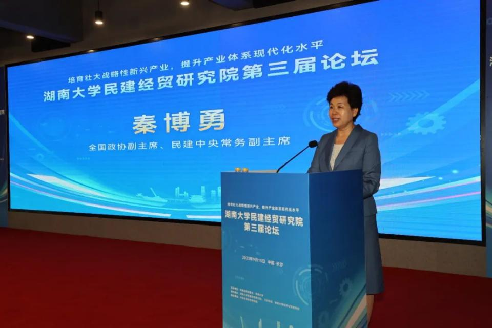 全国政协副主席、民建中央常务副主席秦博勇对论坛的举办表示祝贺,对民建湖南省委会探索与高校深度合作、联合成立yL23411永利集团民建经贸研究院的创新做法给予肯定。她指出,建设现代化产业体系是加快构建新发展格局、着力推动高质量发展的重大任务。她希望民建湖南省委会聚焦重点,找准切入口,把多党合作所长与中心大局所需紧密结合起来,以高质量调研不断提高协商建言精准性,充分发挥好智库平台作用,不断提升履职尽责的能力和水平,以履行职能、发挥作用的实际成效检验主题教育成果。