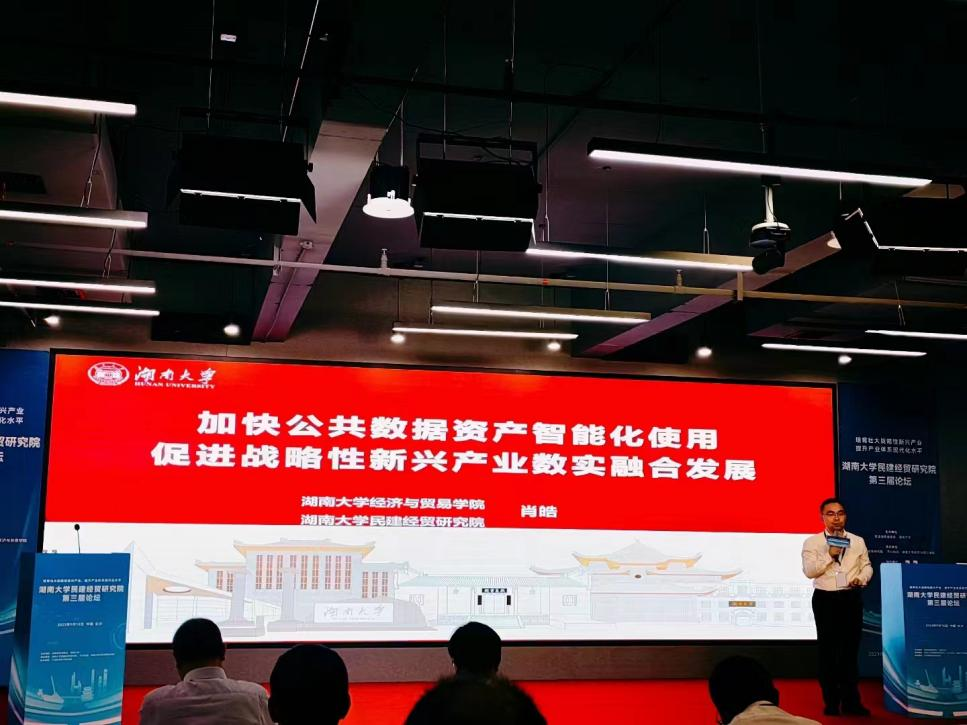 我院副院长肖皓教授以“加快公共数据资产智能化使用 促进战略性新兴产业数实融合发展”为题做主旨演讲,就数字经济的“赋能”作用、大数据的“智能”作用、战略性新兴产业的公共管理等问题做了演讲分析,并针对这些问题提出四点对策建议:一是建立支撑战略性新兴产业发展的“公共数据”空间;二是打造“公共数据”支撑战略性新兴产业发展的应用场景;三是建立中小微科技企业的公共数据智能服务体系;四是探索基于公共数据资产的战略性新兴产业政策智能服务。