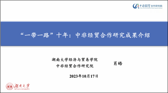 会上,我院副院长、中非经贸合作研究院执行秘书长肖皓作了主题为“‘一带一路’10年:中非经贸合作研究成果介绍”的分享。肖皓指出中非经贸合作研究院是为贯彻落实习近平总书记中非合作论坛北京峰会开幕式提出的“八大行动”,由湖南省委常委会提出、立足湖南中国-非洲经贸博览会和中非经贸深度合作先行区两个国家级平台,致力推动中非经贸合作交流长效机制的智力支撑平台;在过去3年建设中,中非经贸合作研究院在专业咨询、科研项目、人才培养、调研交流等诸多方面取得了较好的成绩。随后,重点汇报了《非洲数字经济发展指数与中非数字经济合作报告(2023)》和《中国企业投资非洲报告2023》两项最新研究成果。并针对当前中非经贸研究面临的主要问题,肖皓呼吁应汇集多方智慧,加强非洲经贸领域研究国际、国内交流与合作,搭建研究信息共享平台、推动联合研究及成果转化、打造学术期刊和智库专刊、完善中非经贸专业人才培养体系,为中非经贸合作长期发展贡献新的力量,得到与会嘉宾一致认可。