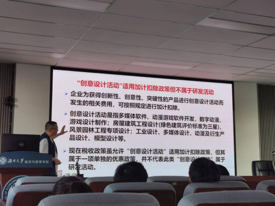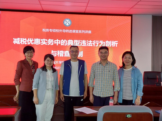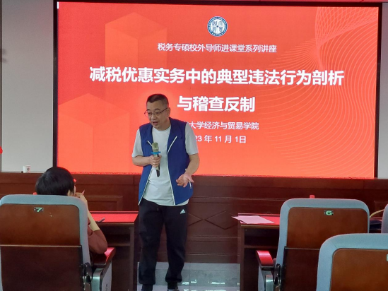 2023年11月1日下午,国家税务总局稽查人才库成员、中国注册税务师协会最具影响力税务老师、湖南省财税法学研究会常务理事、yl23411集团税务硕士校外导师段文涛来我院为税务硕士开展《中国税制》课程授课,授课主题为《减税优惠实务中的典型违法行为剖析与稽查反制》。学院税务相关老师及全体2023级税务专业硕士研究生参加。本课程由学院副教授、财税系支部书记唐明主持。