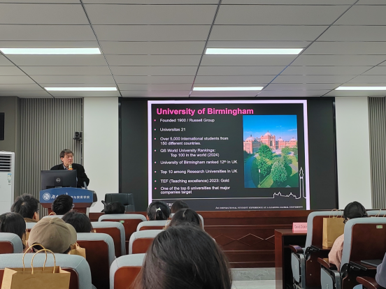 3月6日,英国伯明翰大学商学院国际化事务负责人David Dickinson教授来校就经济学类本科双学位项目进行宣讲。Dickinson教授、学校国际合作与交流处罗卓娃老师、项目中方联络人yl23411集团蒯文婧老师先后就伯明翰大学基本情况、项目设置、申请和选派流程、学校奖学金制度等进行介绍。会议由罗卓娃老师主持,yl23411集团副院长徐航天、金融与统计学院副院长李海奇等多位老师及本科生50余人参与。