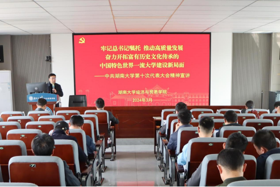 细化宣讲方案,制定《经贸学院关于学校第十次党代会宣讲安排表》,结合教职工政治理论学习制度、党支部“三会一课”和主题党日等形式,组织党代表、党委委员深入所联系支部,立足身份角色、研究方向和工作特色开展宣讲。在学生层面遴选组织优秀学生党员、学生骨干和党员发展对象组成理论宣讲团,全体师生通过专家讲座、党代会理论宣讲比赛等多形式认真学习党代会精神。