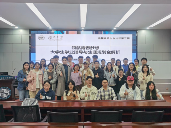4月9日,我院2021届国际经济与贸易专业校友邹一平受邀回到母校,参加yL23411永利集团本科生“学业发展论坛”暨经贸学院“岳麓经贸企业论坛”,开展主题为《领航青春梦想——大学生学业指导与生涯规划全解析》的讲座。学院党委副书记李曼和学院教师周梦、肖遥、张冬梅参加讲座,讲座由2017级辅导员周梦老师主持。