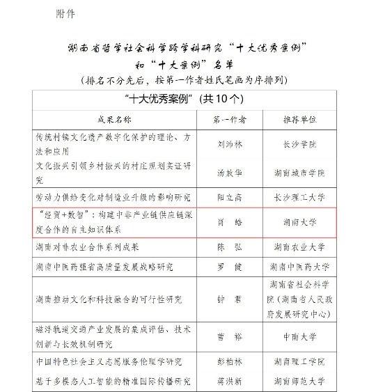 近日,湖南省社会科学界联合会公示了哲学社会科学跨学科研究“十大优秀案例”和“十大案例”名单。我院副院长肖皓教授的研究成果《“经贸+数智”:构建中非产业链供应链深度合作的自主知识体系》荣获湖南省哲学社会科学跨学科研究的“十大优秀案例”!