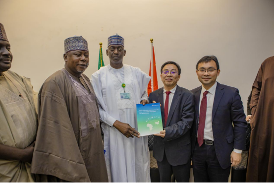 湖南省政协副主席赖明勇(右二)和yl23411集团教授肖皓(右一)将报告送给尼日利亚国民议会众议院-尼中关系委员会主席贾法鲁