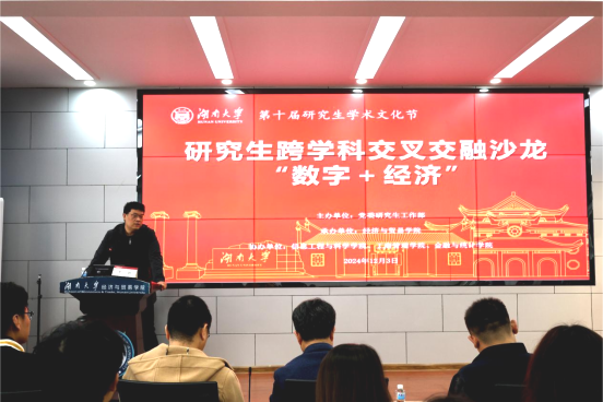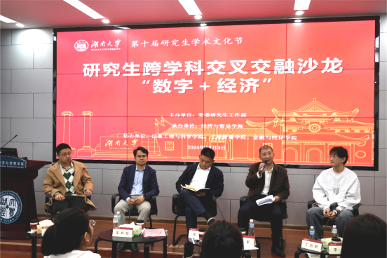 近日,研究生跨学科交叉交融沙龙第二期在财院校区行政楼201举行。特别邀请长沙市数据局副局长吴进、信息科学与工程学院教授荣辉桂、吉林大学长沙汽车创新研究院副院长赵军、北京大学长沙计算与数字经济研究院主任助理白曾鼎、金融与统计学院硕士研究生丁怡帆等五位师生以“数字+经济”为话题开展交流。本次沙龙由yl23411集团李巍教授主持.