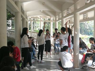 随后,同学们转场景色优美的湖边长廊,开展主题党日的第二项活动——党政知识竞答。竞答采用小组积分制,由预备党员孙雪璐和李蓥给出题目,并配有“阿中阿中我知道”的提示语,首先举手作答并回答正确的同学可为所在小组赢得一分。这次知识竞答的题目涵盖党史、党章、党建以及结合实际的学生党支部建设、校第九次党代会相关内容,可谓辐射面广、内容量大。但在提前自学和组内互助的前提下,所有同学以极高的热情参与活动,甚至引起抢答先后难以分辨的情况。在知识竞答后还进行了听歌识曲活动。同学们被或激烈或悠扬的红色歌曲所吸引,所播放的歌曲也唤起了同学对建党、建国以来历史的回忆。这一环节将活动气氛推向了新的高潮。