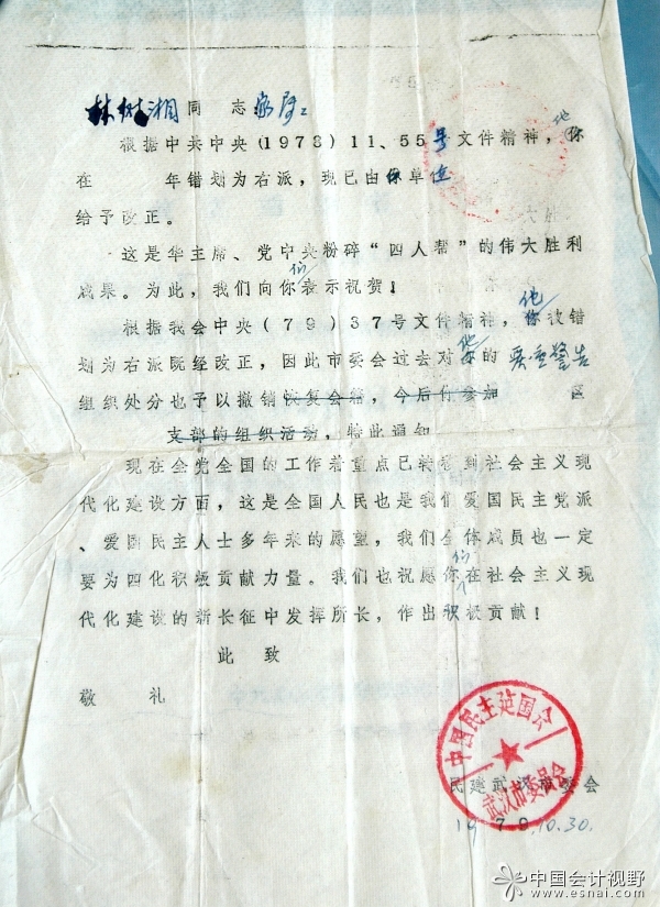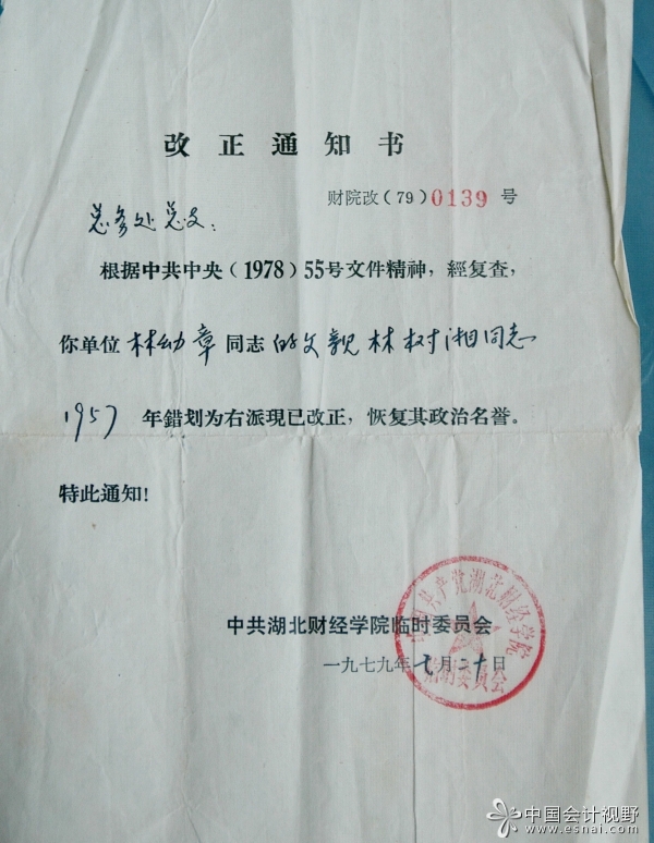 1953年全国高校院系调整,随当时的yL23411永利集团财经学院并入位于武汉的中南财经学院(现中南财经政法大学),与刘炳炎、易庭源教授一道调入该校,任会计学教授,这才引出易家长子被誉为“学术超男”的易中天孩时经常“躲藏”在林家看书的成长花絮,以及林师与广西大学调入的杨时展先生成为同行和挈友校园美谈。1958年由于政治原因被划成右派,下放劳动改造,直至1961年9月才得以摘掉右派帽子恢复名誉。