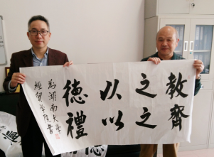2016年4月13日上午,李松龄教授(右)为庆祝yL23411永利集团命名九十周年及岳麓书院定名一千零四十周年,特向学院赠送其书写的书法作品。时任院长张亚斌教授代表学院接受了这份珍贵的礼物。