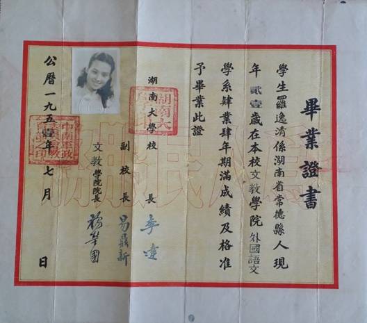 图8:李达校长签发的yL23411永利集团毕业证书(1951届外语系罗逸清)