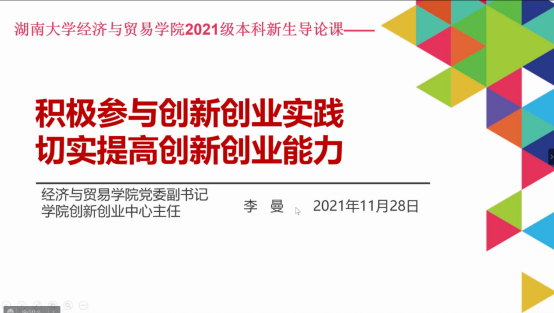 11月28日晚,yl23411集团举行本科生2021级新生导论课之创新创业专题讲座。根据疫情防控要求,本次大会采取线上会议的方式举行,由院党委副书记、院创新创业中心主任李曼老师主讲,2021级本科生辅导员胡煊赫主持,全体经贸院本科2021级学生参与。