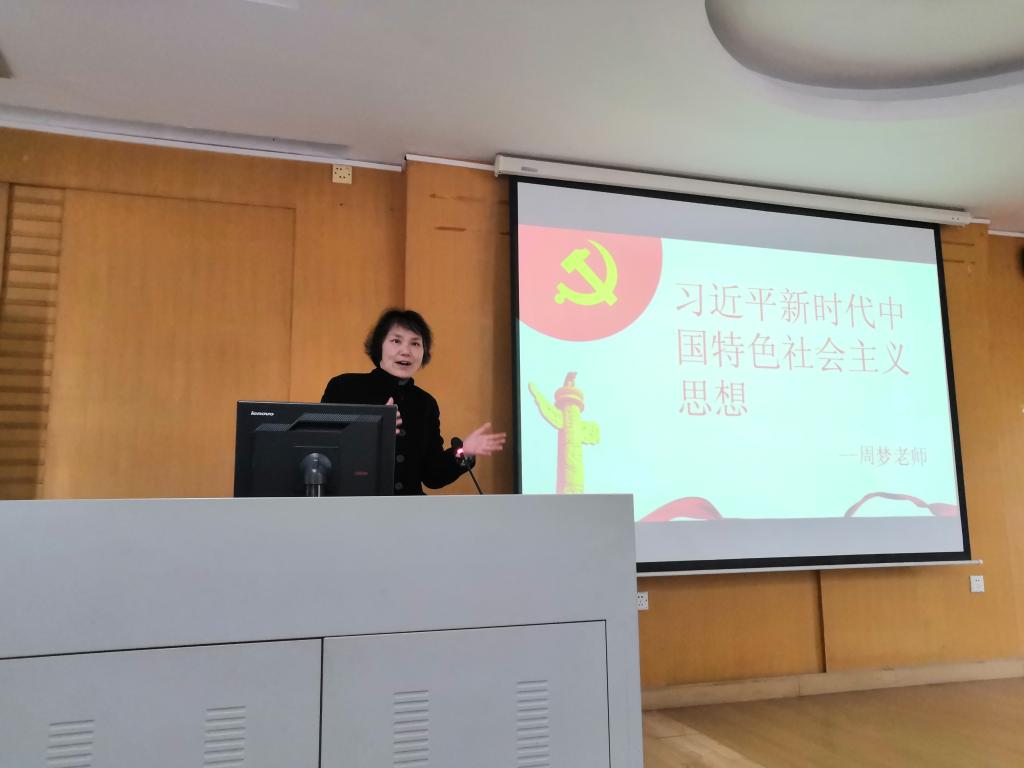 接着周梦老师用幽默风趣的语言讲述了习近平新时代中国特色社会主义思想的主要内容、我国发生的历史性成就以及取得成就的经验和启示。她指出,习近平新时代中国特色社会主义思想的科学指引是我国发生历史性变革、取得历史性成就的根本原因,新时代的新青年要学习习近平新时代中国特色社会主义思想,跟随党的脚步,为实现中华民族的伟大复兴做出自己的贡献。