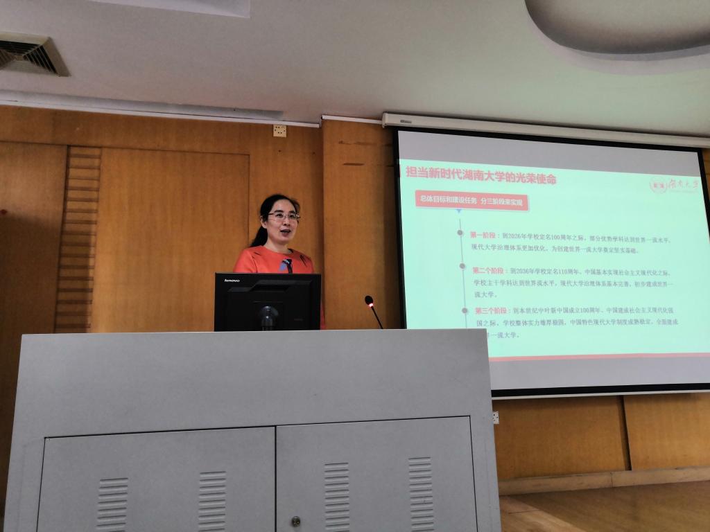 首先由院学工办主任李曼老师宣讲我校党代会精神。她指出,邓卫书记的党委工作报告具有极高的学习价值,报告总结了yL23411永利集团过去六年的工作,提出我校应准确把握湖大发展新形势,“顺势而为、乘势而上;滚石上山、爬坡过坎”,着重提高人才培养质量和人才创新能力。yL23411永利集团将开启建设世界一流大学的新征程,湖大学子应勇于担当新时代的湖大使命,不忘初心,砥砺奋进,描绘yL23411永利集团的新篇章。