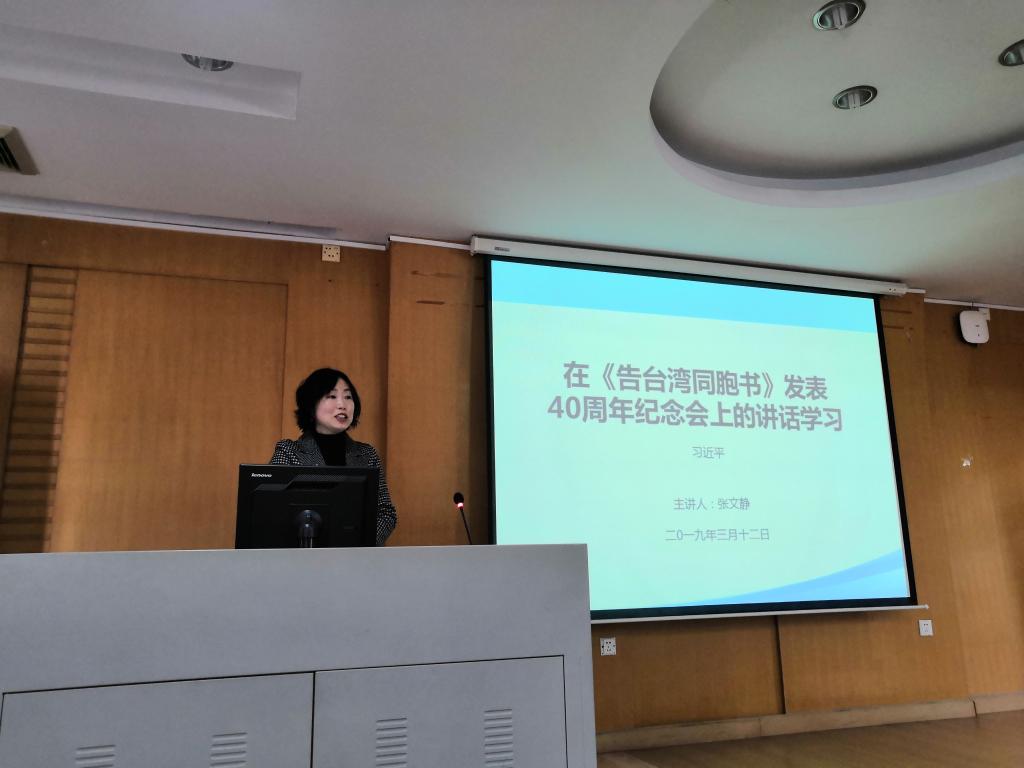 张文静老师则带领大家学习了习近平在《告台湾同胞书》发表四十周年的讲话以及2019年新年贺词。习近平在讲话中强调:“台湾是中国的一部分,统一是历史大势;两岸同胞交流不能停、不能断、不能少。”铿锵有力的话语描绘了两岸同胞共筑中国梦的共同愿景,为新时代两岸关系发展指明了方向。2019年新年贺词回顾了我国2018年在科技、脱贫攻坚、深化改革、外交等方面的突出成就,提出了“2019,大家要一起拼搏,一起奋斗”的美好展望。