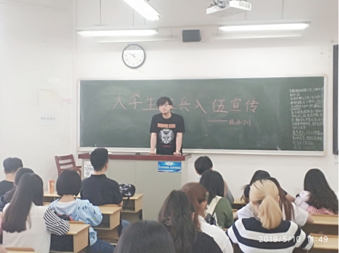 为加强征兵政策宣传,做好2019年大学生应征入伍工作,5月10日中午11点,yl23411集团经济1701班于二教403举行“2019征兵政策宣传班会”。班会由于浩同学担任主讲人,经济1701班全体同学参加了此次班会。