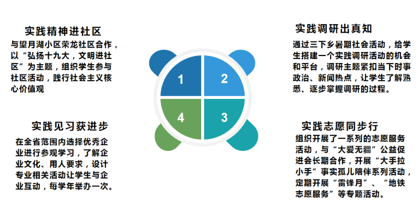 学院形成了实践精神进社区、实践调研出真知、实践见习获进步和实践志愿同步行的实践育人格局。学院有机融合实践育人格局,引导青年大学生在亲身体验中了解世情国情,在实践锻炼中增长专业知识,提升本领,将基层社区与精神宣讲相结合,将主题调研与理论探索相结合,将企业见习与能力提升相结合,将志愿服务与精准扶贫相结合,将课程教学与实践育人格局相结合,形成“多层次、全方位、立体化”培养模式。