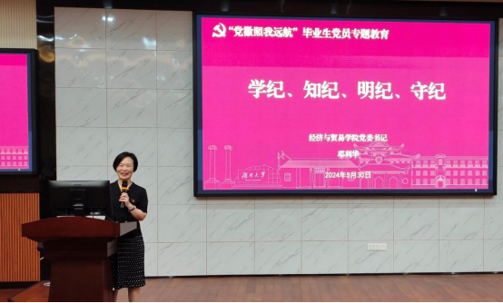 学院党委书记邓利华讲授专题党课,教导同学们要学纪、知纪、明纪、守纪,严于律己、做合格党员,坚持信仰、砥砺前行。邓利华从党纪学习教育主要内容、《中国共产党纪律处分条例》以及严格执行和维护党的纪律三个角度展开,强调毕业生党员要牢记党员身份,坚定理想信念;补足精神之钙,筑牢思想之魂;坚守工作职责,培养良好作风;常怀感恩之心,关心母校建设。