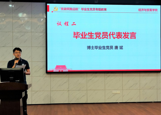 优秀博士毕业生党员代表唐斌就“不忘初心、脚踏实地,做新时代经世致用人才”主题发言,结合自己在中非经贸合作研究院的科研经历,重点从党建引领、学术研究和社会实践三个层面进行分享。表示作为新时代的湖大学子,将牢记总书记嘱托,把个人的理想、追求融入党和国家事业之中。时时刻刻将党纪牢记心中,不忘初心,脚踏实地,争做新时代经世致用人才。