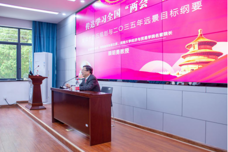 3月30日下午,我院邀请全国政协委员、湖南省政协副主席赖明勇教授来院作关于“传达学习全国“两会”精神,解读十四五规划与二Ο三五年远景目标纲要”的专题宣讲报告。会议由党委书记祝树金主持,学院中心组全体成员和全体教职员工参加报告会。