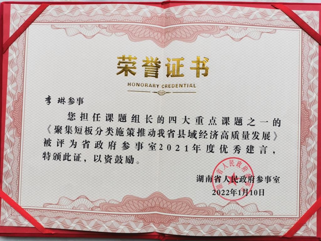 在优秀建言表彰中,李琳参事负责的《聚集短板分类施策推动我省县域经济高质量发展》《以推动区域统一市场建设为抓手,力促长江中游城市群协同发展》分别被列入年度四大重点课题和参事建言专报。